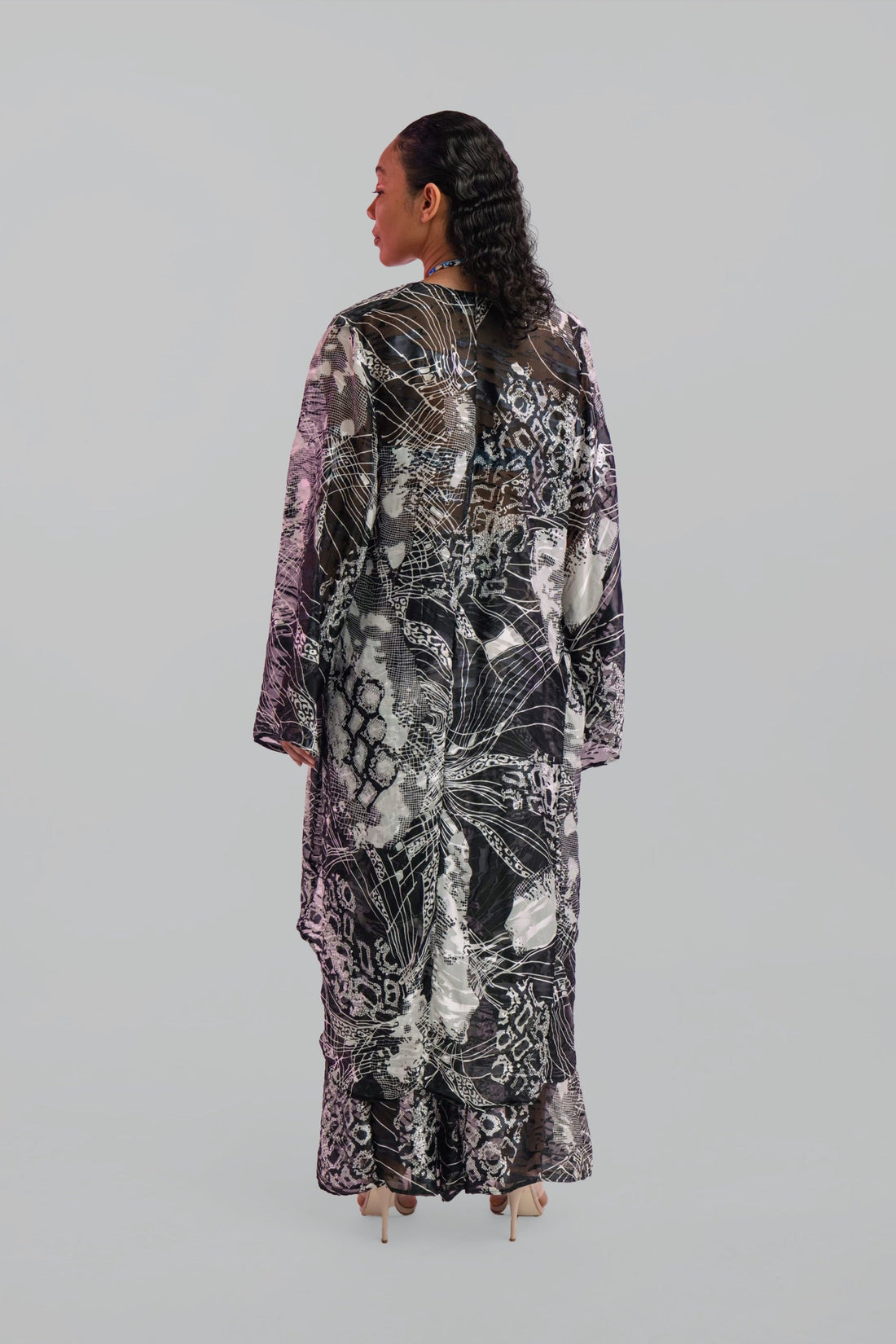 Sina Silk Cover Up TopKey Features: Intricate black and white graphic print Open-front design Falls...
