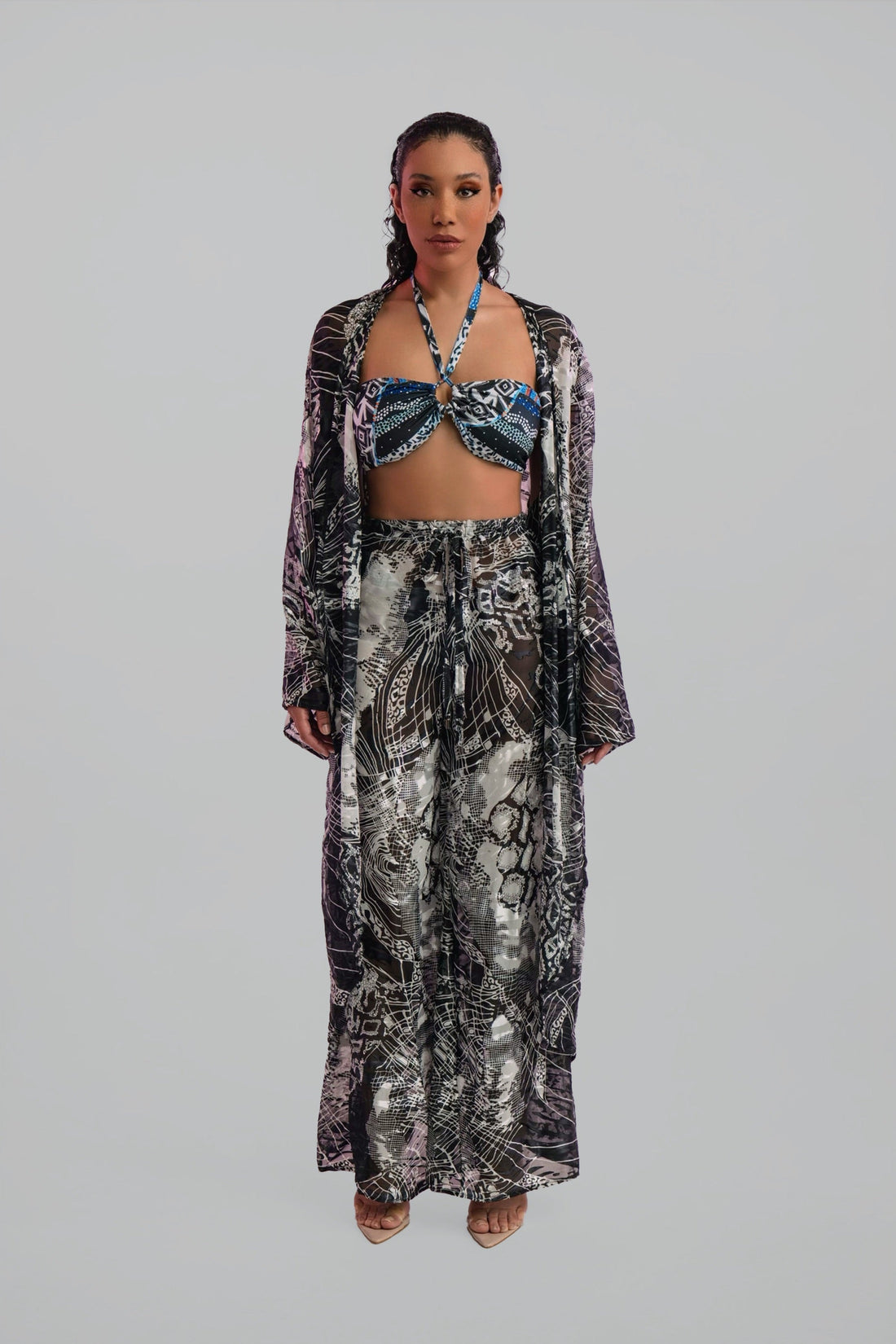 Sina Silk PantsKey Features: Intricate black and white graphic print Drawstring waistband Made in the...
