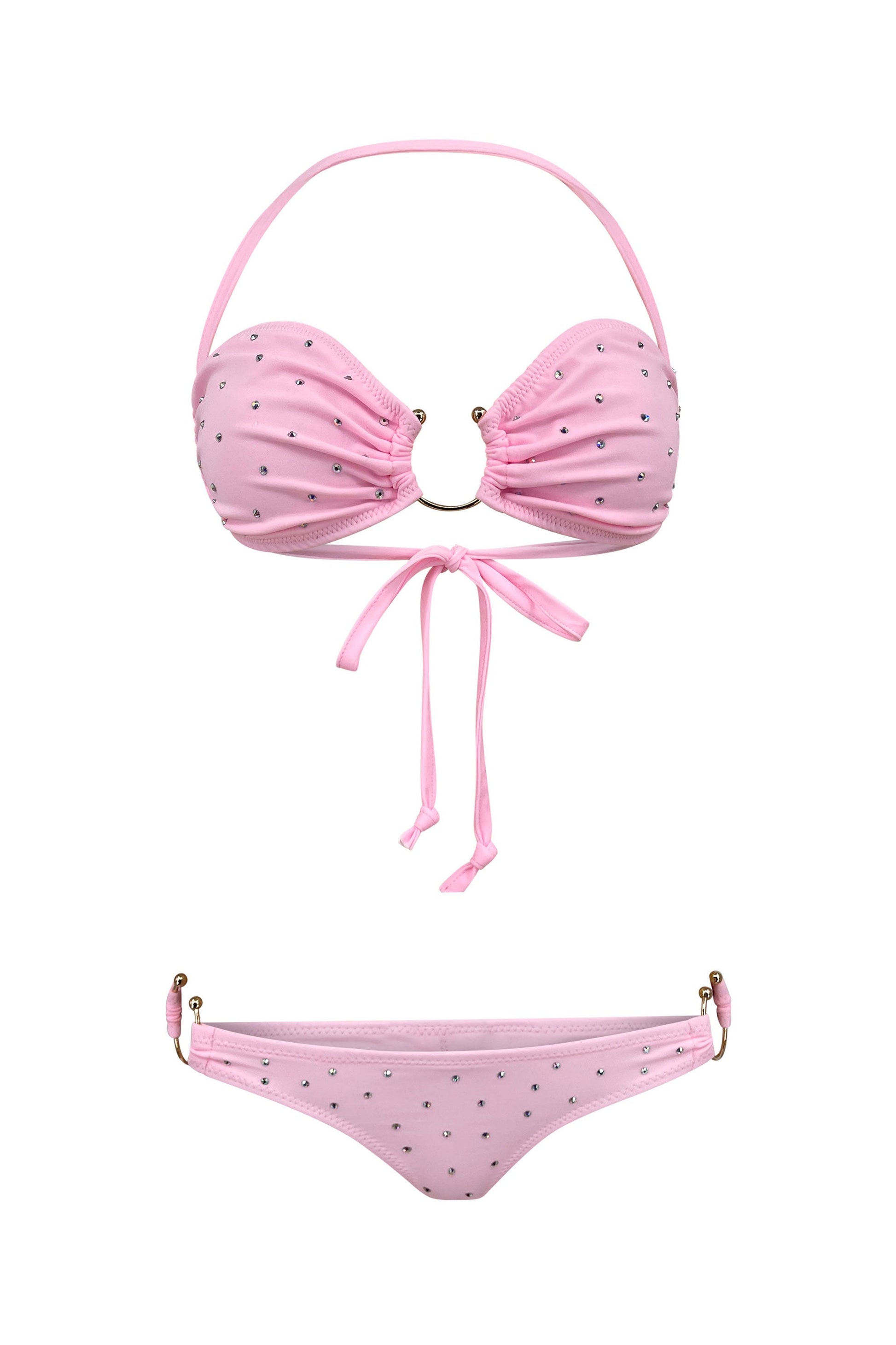 The Hailey Crystal Bikini is a standout in pastel pink, featuring exquisite crystal rhinestone detailing. The bandeau top is adorned with a gold “U” ring at the center, while the step-in Brazilian bottoms highlight two open gold “U” ring accents. This bikini is perfect for pink-lovers.