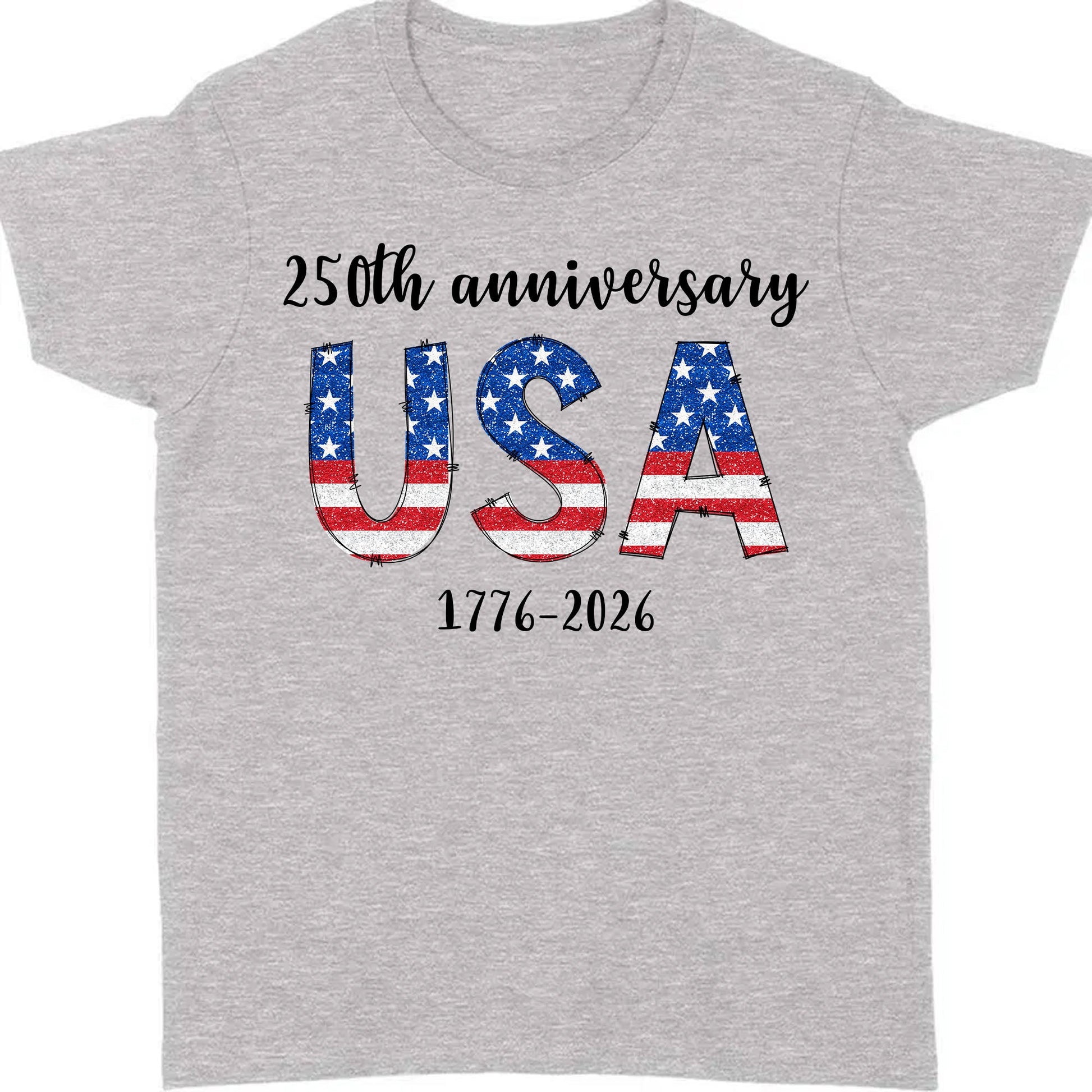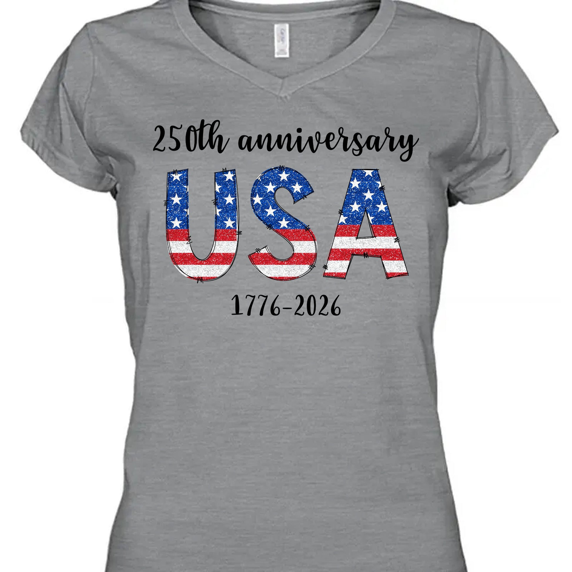 Mark the USA's Semiquincentennial with this classic and stylish commemorative t-shirt. Featuring a bold “USA” design with American flag print and elegant script, it’s perfect for showing your patriotism at every 4th of July celebration leading up to 2026!