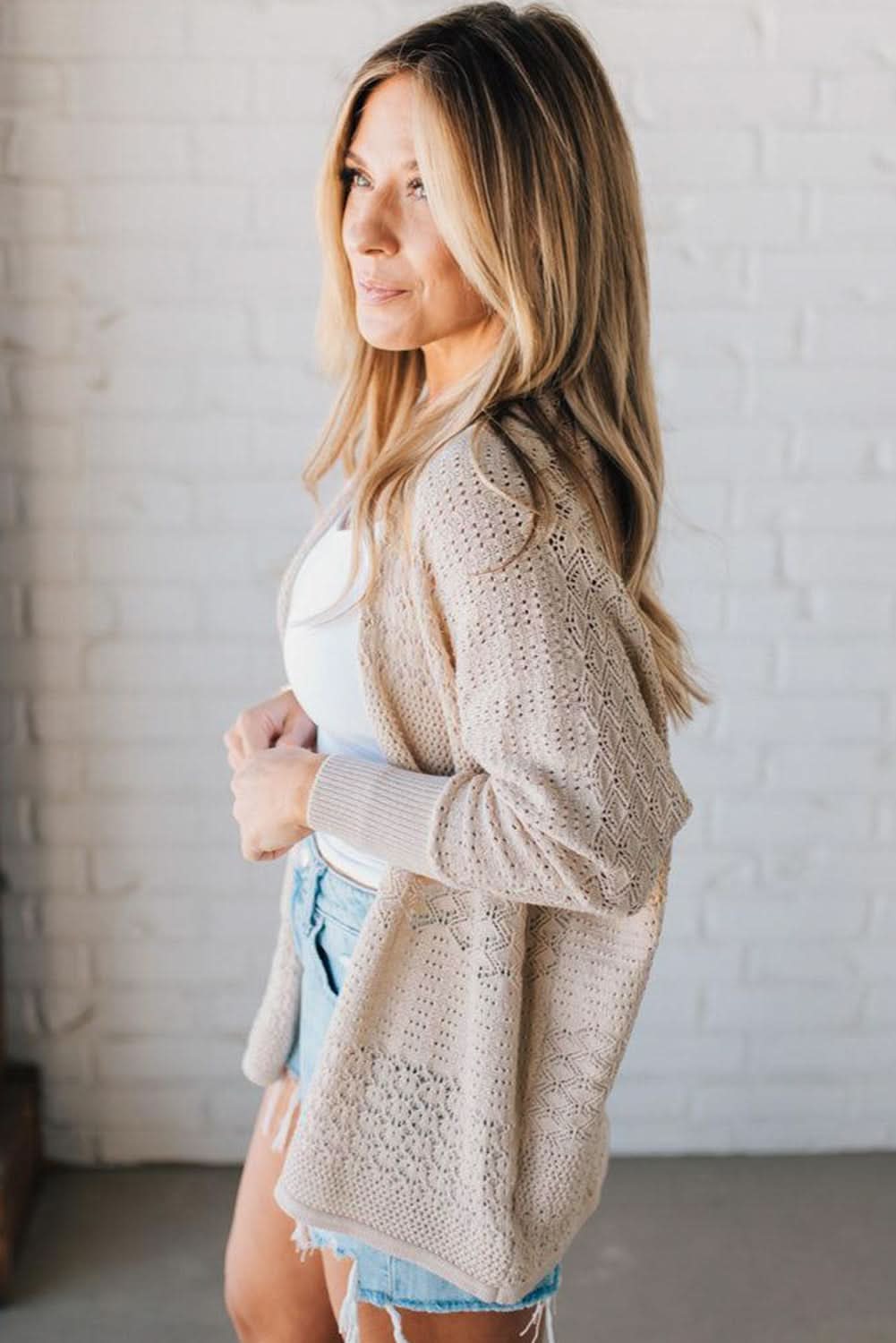 - Crafted from mix pattern fabric, this hollow knit cardigan exudes elegance and uniqueness.