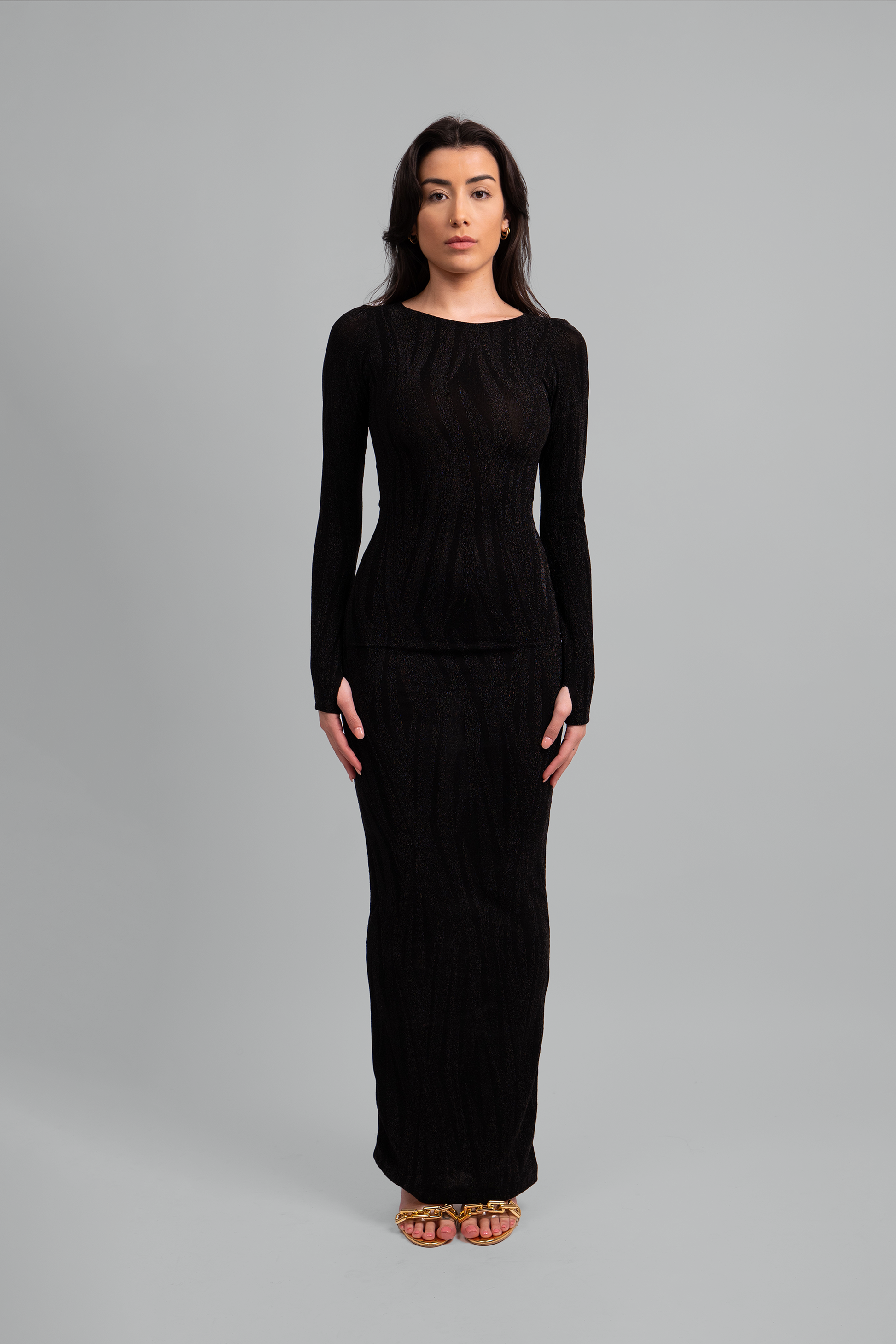 The Regality Dress seamlessly combines chic style and comfort. Its floor-length silhouette is crafted from striking stretch fabric, featuring a horizontal geometric shimmer print fabric. The unique thumb cut-out sleeves add flair while keeping your wrists warm during colder months.